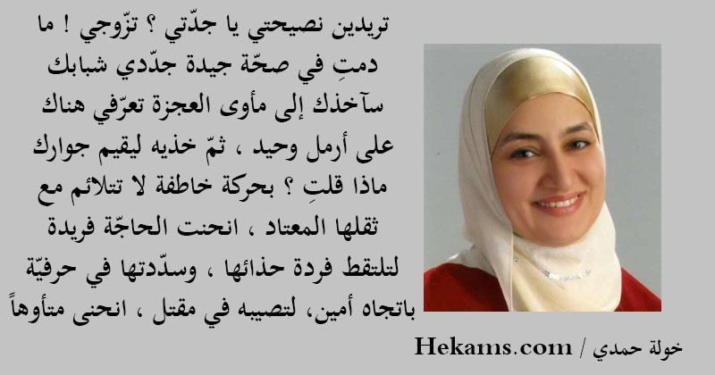 تريدين نصيحتي يا جدّتي؟ تزّوجي! ما دمتِ في صحّة جيدة جدّدي شبابك ، سآخذك إلى مأوى العجزة تعرّفي هناك على أرمل وحيد، ثمّ خذيه ليقيم جوارك ، ماذا قلتِ؟ بحركة خاطفة لا تتلائم مع ثقلها المعتاد، انحنت الحاجّة فريدة لتلتقط فردة حذائها، وسدّدتها في حرفيّة باتجاه أمين، لتصيبه في مقتل، انحنى متأوها. - خولة حمدي