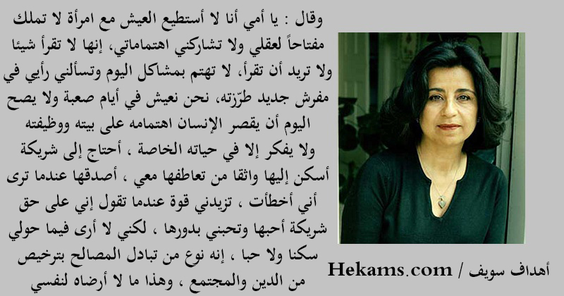 وقال: يا أمي أنا لا أستطيع العيش مع امرأة لا تملك مفتاحاً لعقلي ولا تشاركني اهتماماتي، إنها لا تقرأ شيئا ولا تريد أن تقرأ،لا تهتم بمشاكل اليوم وتسألني رأيي في مفرش جديد طرّزته، نحن نعيش في أيام صعبة ولا يصح اليوم أن يقصر الإنسان اهتمامه على بيته ووظيفته، ولا يفكر إلا في حياته الخاصة. أحتاج إلى شريكة أسكن إليها واثقا من تعاطفها معي، أصدقها عندما ترى أني أخطأت، تزيدني قوة عندما تقول إني على حق، شريكة أحبها وتحبني بدورها، لكني لا أرى فيما حولي سكنا ولا حبا، إنه نوع من تبادل المصالح بترخيص من الدين والمجتمع، وهذا ما لا أرضاه لنفسي. - أهداف سويف