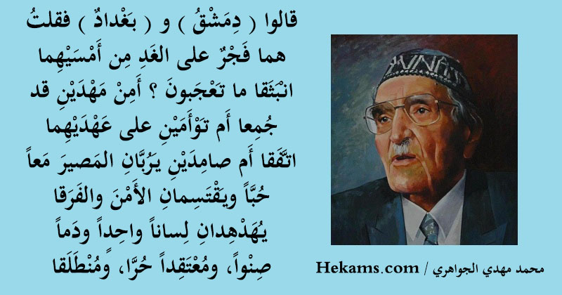 قالوا ( دِمَشْقُ ) و( بَغْدادٌ ) فقلتُ هما فَجْرٌ على الغَدِ مِن أَمْسَيْهِما انْبَثَقا ما تَعْجَبونَ ؟ أَمِنْ مَهْدَيْنِ قد جُمِعا أَم تَوْأَمَيْنِ على عَهْدَيْهِما اتَّفَقا أَم صامِدَيْنِ يَرُبَّانِ المَصيرَ مَعاً حُبَّاً ويَقْتَسِمانِ الأَمْنَ والفَرَقا يُهَدْهِدانِ لِساناً واحِداً ودَماً صِنْواً، ومُعْتَقِداً حُرَّا،ً ومُنْطَلَقا. - محمد مهدي الجواهري