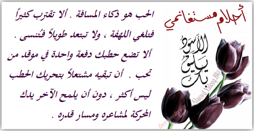 الحب هو ذكاء المسافة . ألا تقترب كثيرًا فتُلغي اللهفة ، ولا تبتعد طويلاً فتُنسَى . ألا تضع حطبك دفعة واحدة في موقد من تُحبّ .أن تُبقيه مشتعلا بتحريكك الحطب ليس أكثر ، دون أن يلمح الآخر يدك المحرّكة لمشاعره ومسار قدره - احلام مستغانمي