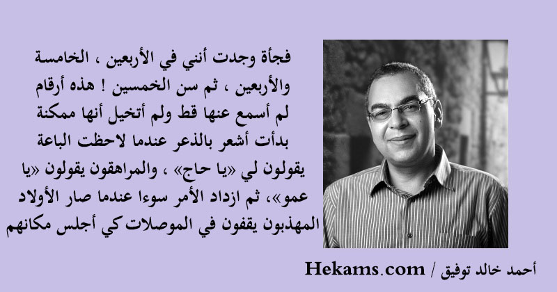 فجأة وجدت أنني في الأربعين ، الخامسة والأربعين ، ثم سن الخمسين! هذه أرقام لم أسمع عنها قط ولم أتخيل أنها ممكنة ، بدأت أشعر بالذعر عندما لاحظت الباعة يقولون لي «يا حاج»، والمراهقون يقولون «يا عمو»، ثم ازداد الأمر سوءا عندما صار الأولاد المهذبون يقفون في الموصلات كي أجلس مكانهم. - أحمد خالد توفيق