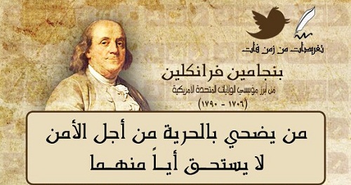 من يتخلى عن حريته خوفا على أمنه، لا يستحق حرية ولا يستحق أمناً. - بنيامين فرانكلين (رئيس امريكي سابق)