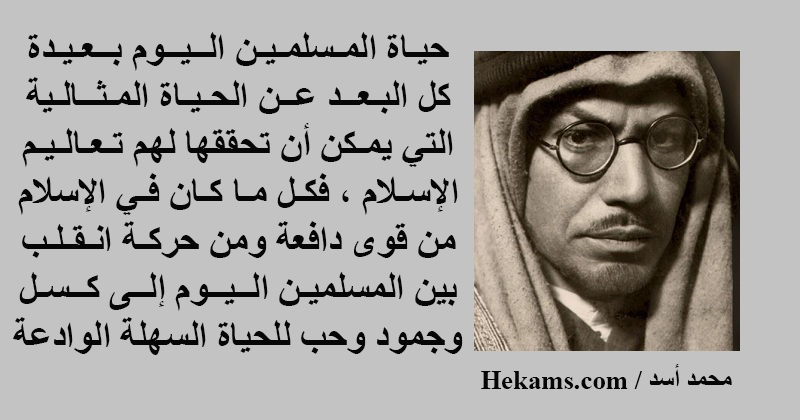 حياة المسلمين اليوم بعيدة كل البعد عن الحياة المثالية التي يمكن أن تحققها لهم تعاليم الإسلام ، فكل ما كان في الإسلام من قوى دافعة ومن حركة ، انقلب بين المسلمين اليوم إلى كسل وجمود وحب للحياة السهلة الوادعة. - محمد أسد
