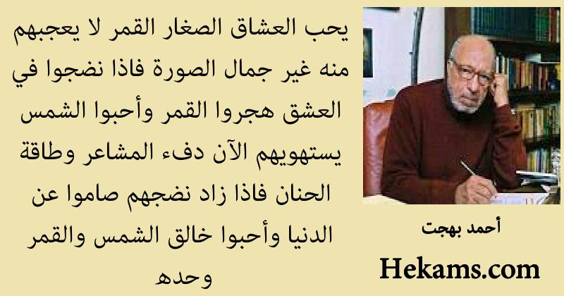 يحب العشاق الصغار القمر لا يعجبهم منه غير جمال الصورة فاذا نضجوا في العشق هجروا القمر وأحبوا الشمس يستهويهم الآن دفء المشاعر وطاقة الحنان فاذا زاد نضجهم صاموا عن الدنيا وأحبوا خالق الشمس والقمر وحده. - أحمد بهجت