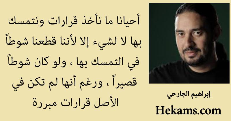 أحيانا ما نأخذ قرارات ونتمسك بها لا لشيء إلا لأننا قطعنا شوطاً في التمسك بها ، ولو كان شوطاً قصيراً ، ورغم أنها لم تكن في الأصل قرارات مبررة. - إبراهيم الجارحي