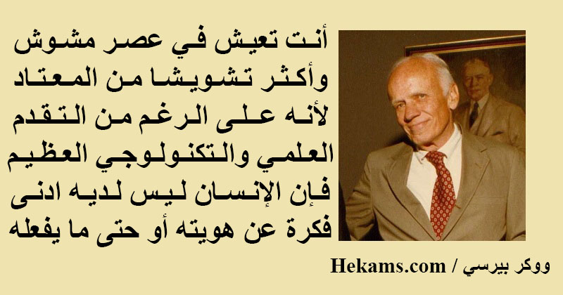 أنت تعيش في عصر مشوش ، وأكثر تشويشا من المعتاد لأنه على الرغم من التقدم العلمي والتكنولوجي العظيم ، فإن الإنسان ليس لديه ادنى فكرة عن هويته أو حتى ما يفعله. - ووكر بيرسي