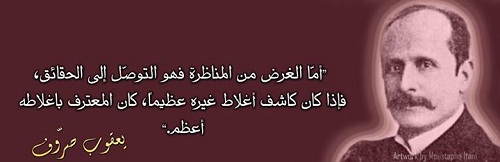 أمّا الغرض من المناظرة فهو التوصّل إلى الحقائق، فإذا كان كاشف أغلاط غيره عظيماً، كان المعترف بأغلاطه أعظم. - يعقوب صروف
