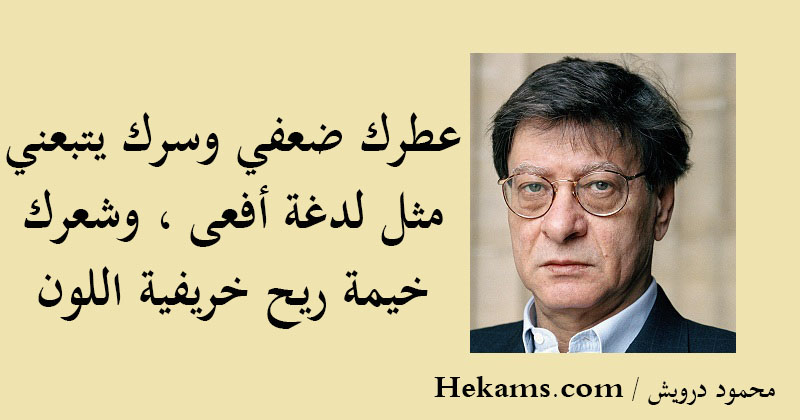 عطرك ضعفي وسرك يتبعني مثل لدغة أفعى ، وشعرك خيمة ريح خريفية اللون. - محمود درويش