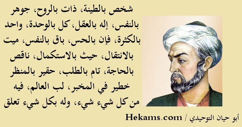 شخص بالطينة، ذات بالروح، جوهر بالنفس، إله بالعقل، كل بالوحدة، واحد بالكثرة، فإن بالحس، باق بالنفس، ميت بالانتقال، حيث بالاستكمال، ناقص بالحاجة، تام بالطلب، حقير بالمنظر، خطير في المخبر، لب العالم، فيه من كل شيء شيء، وله بكل شيء تعلق. - أبو حيان التوحيدي