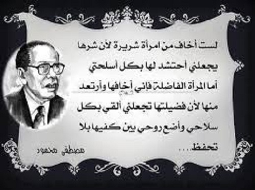 لست أخاف من امرأة شريرة لأن شرها يجعلني أحتشد لها بكل أسلحتي , أما المرأة الفاضلة فإني أخافها وأرتعد منها لأن فضيلتها تجعلني ألقي بكل سلاحي وأضع روحي بين كفيها بلا تحفظ. - مصطفى محمود